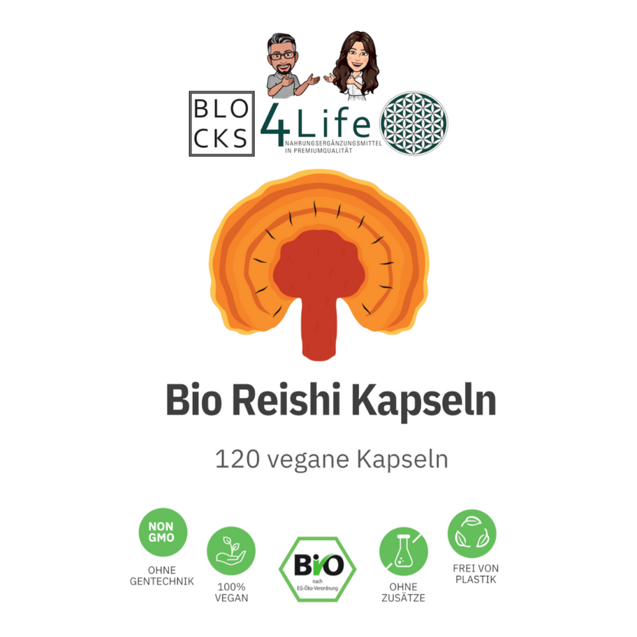 Unsere veganen Bio-Reishi-Kapseln bieten 400 mg hochwertiges Pilzpulver aus dem ganzen Fruchtkörper des Reishi-Pilzes, aus kontrolliert biologischem Anbau, pro Kapsel.